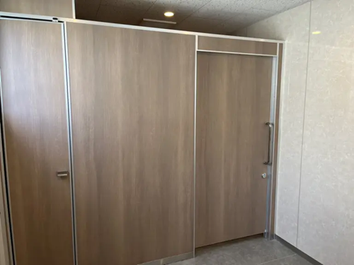 以前の閉塞感がある空間から、明るく清潔感のある個室へ一新した女性トイレのリニューアル事例です。白を基調にしつつ、背面には落ち着いた木目調パネルを取り入れて柔らかな印象に仕上げました。機能性の向上と内観の清潔感が、女性利用者の満足度を上げています。